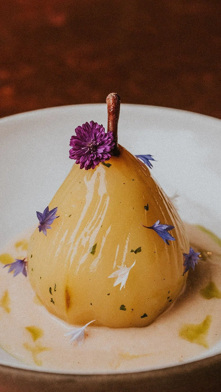local poached star crimson pear, pear puree, fresh cheese, walnuts, lemon verbena, fennel pollen, mint oil (gf)